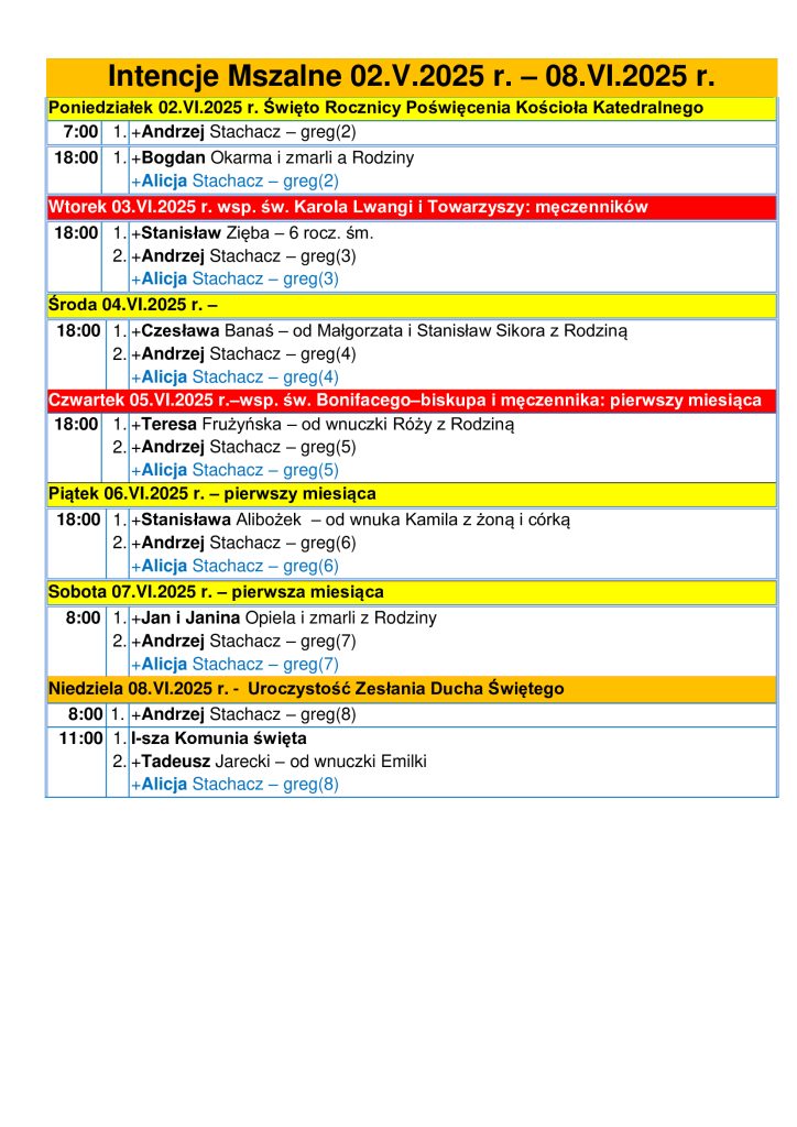 Intencje Mszalne 02.06 – 08.06.2025