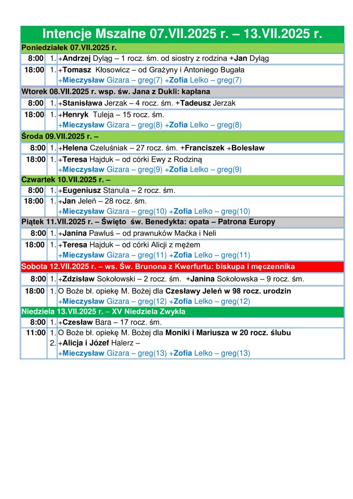Intencje Mszalne 07.07 – 13.07.2025