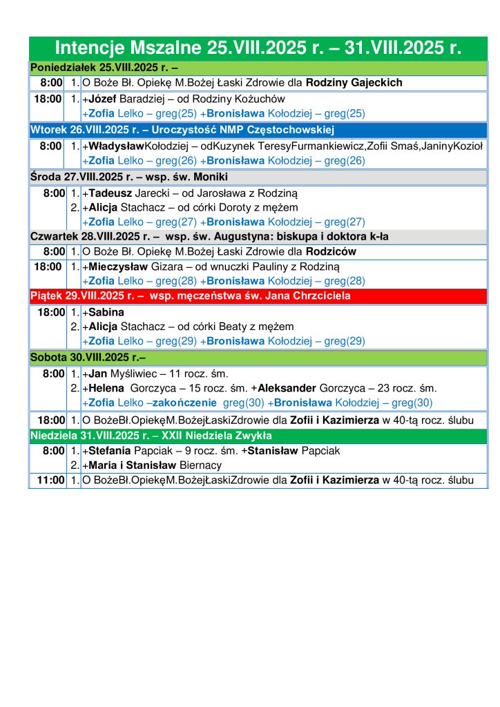 Intencje Mszalne 25.08 – 31.08.2025