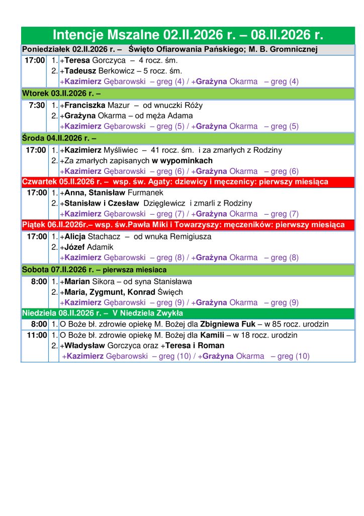 Intencje Mszalne 02.02.2026 – 08.02.2026