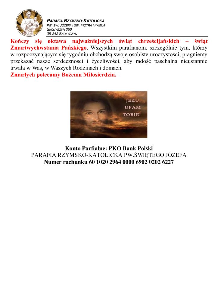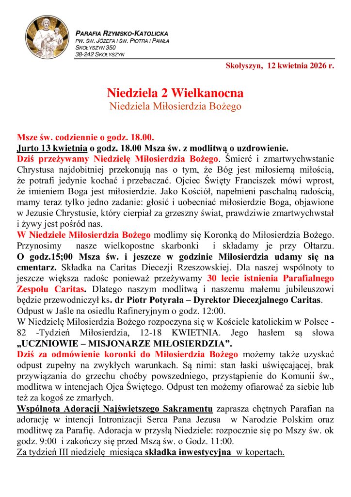Niedziela 2 Wielkanocna – Miłosierdzia Bożego